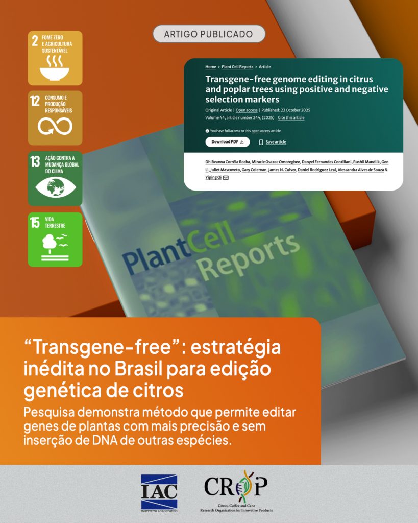 Nesse contexto, um estudo, fruto da tese de doutorado da Dhiôvanna Corrêia Rocha sob orientação da Dra. Alessandra Alves de Souza, investigou uma nova estratégia de edição genética em citros. A pesquisa traz para o agro brasileiro uma nova tecnologia de edição genética, conhecida como “transgene-free”, que permite realizar modificações no DNA das plantas sem a necessidade de inserir material genético de outras espécies.